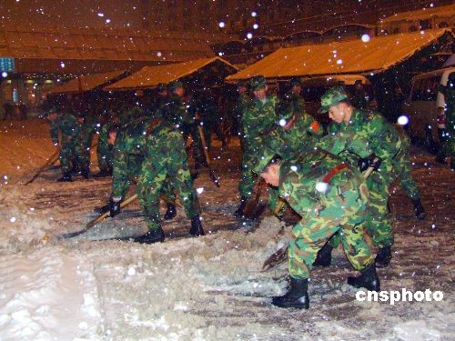 圖:南京軍區(qū)官兵深夜在杭州火車站掃雪