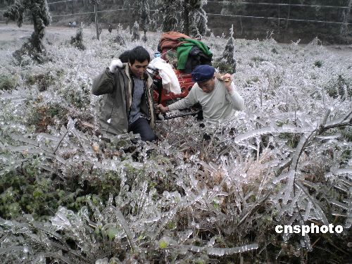 廣西最近遭遇嚴(yán)重雨雪冰凍災(zāi)害,電力、通訊設(shè)施受到嚴(yán)重影響,圖為中國(guó)移動(dòng)廣西公司搶修人員抬柴油機(jī)進(jìn)入“冰”山搶修移動(dòng)基站。中國(guó)移動(dòng)廣西公司已啟動(dòng)最高等級(jí)應(yīng)急通信方案,全力保障通信網(wǎng)絡(luò)暢通,向重災(zāi)區(qū)提供信息發(fā)布綠色通道和延遲停機(jī)等服務(wù),為抗災(zāi)救災(zāi)提供通信保障。中新社發(fā) 申蓓 攝