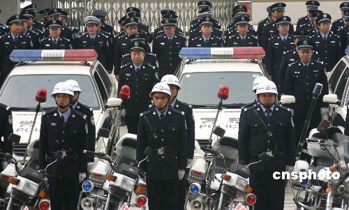 2月3日,公安警察莊嚴(yán)宣誓。當(dāng)日,重慶永川區(qū)公安局舉行“2008東亞女足錦標(biāo)賽安保工作誓師大會”,全局500名干警參加了誓師大會,確保治安環(huán)境,確保女足錦標(biāo)賽順利舉行。中新社發(fā) 陳仕川 攝