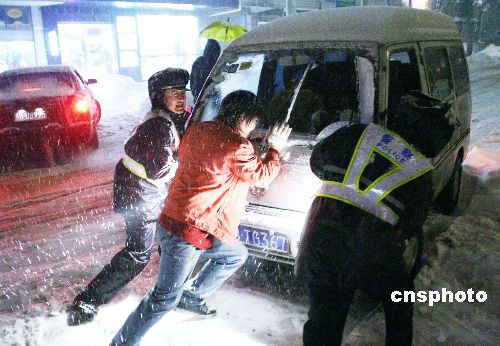2月1日晚,交巡警在推動(dòng)一輛陷于雪堆中的汽車(chē)。江蘇宜興市再次遭受暴雪襲擊,宜興市公安交巡警大隊(duì)的眾多交巡警冒雪到交通要道指揮交通,為群眾排憂(yōu)解難。中新社發(fā) 丁煥新 攝