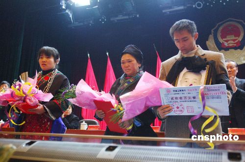 2月4日,貴州省委、省政府召開(kāi)電視電話會(huì)議,表彰抗雪災(zāi)犧牲在崗位上的民警歐光權(quán)。歐光權(quán)是貴州省臺(tái)江縣看守所民警,在抗雪災(zāi)一線超負(fù)荷工作,1月21日因積勞成疾突發(fā)腦溢血倒在崗位上,經(jīng)搶救無(wú)效光榮犧牲,終年57歲。2月2日,公安部部長(zhǎng)孟建柱簽署命令,追授歐光權(quán)為全國(guó)公安二級(jí)英模。表彰會(huì)上有關(guān)領(lǐng)導(dǎo)一次性向歐光權(quán)的家屬頒發(fā)獎(jiǎng)金21萬(wàn)元。中新社發(fā) 吳東俊 攝