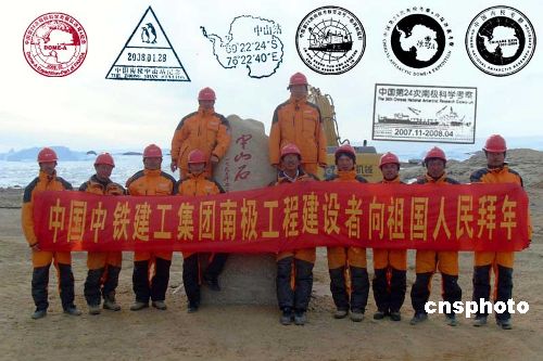 春節(jié)將至,隨中國第24次南極考察計劃在南極實施中山站建設工程的中國中鐵建工集團11名職工,在中山站紀念碑前向祖國人民拜年。南極地理狀況復雜,基巖硬度高,凍土層深的條件下,每天工作16個小時以上,園滿的完成了各工程節(jié)點的任務,被稱為“鐵軍”。中新社發(fā) 同德 攝