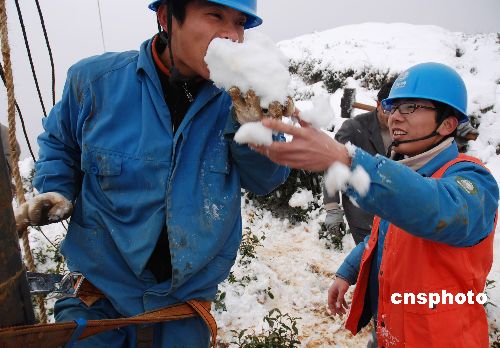 2月6日,電力搶修隊員在海撥600米的高山雪地里吃年夜飯。據(jù)悉,近日雪災造成浙江嵊州21條主要供電線路中斷供電,該市供電局每天出動500余人進行抗災自救。2月6日,該市供電局200多名黨員干部組成6支電力搶修突擊隊員,對該市貴門、里南、長樂3個未通電鄉(xiāng)鎮(zhèn)開展春節(jié)供電大會戰(zhàn),當晚6時前,該市全面修復供電,實現(xiàn)新春零斷電。中新社發(fā) 張亮宗 攝
