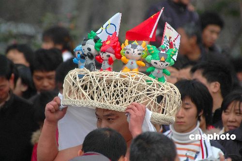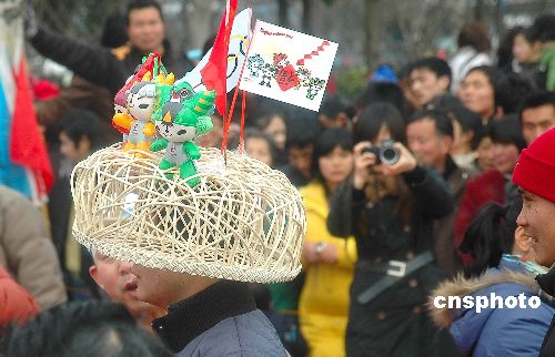 2月8日,一位頭頂“鳥巢”的市民出現(xiàn)在杭州公園,成為游人爭相追逐的“明星”。據(jù)悉,該帽是杭州市冬泳協(xié)會(huì)的杜仲明設(shè)計(jì),請(qǐng)師傅用藤條做出的“鳥巢”,放上“五福娃”,特意為08新年冬泳“亮相”而裝扮。中新社發(fā) 引煒 攝