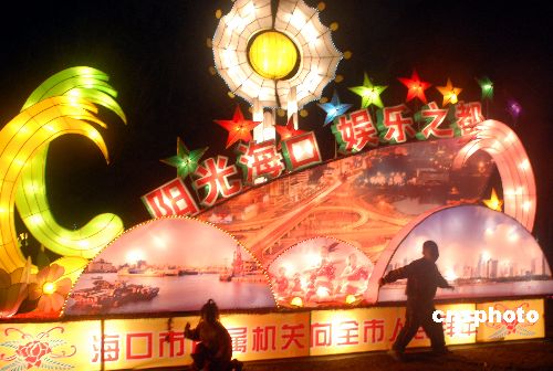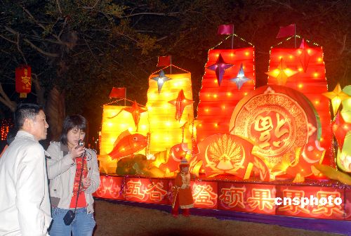 2008年2月7日晚,游人在“現(xiàn)代都市”燈前休閑觀賞。農歷大年初一,眾多市民和游客到?谌f綠園觀賞“華燈璀璨耀椰城”大型燈展。中新社發(fā) 善平 攝