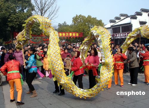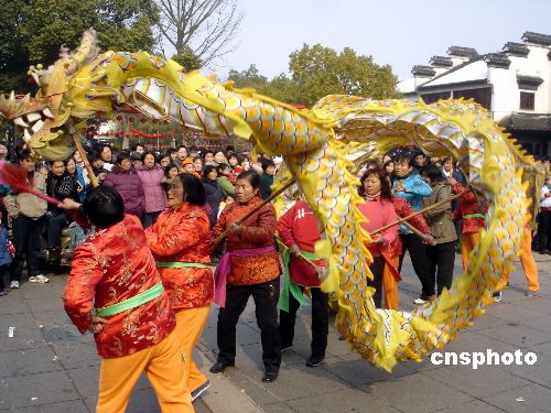 2月8日農(nóng)歷大年初二,一支由蘇州古鎮(zhèn)同里農(nóng)村婦女組成的舞龍表演隊(duì)在同里鎮(zhèn)退思廣場(chǎng)上表演,給節(jié)日的古鎮(zhèn)增添了濃濃的喜慶氣氛,吸引了眾多古鎮(zhèn)居民和中外游客觀看。中新社發(fā) 王建康 攝