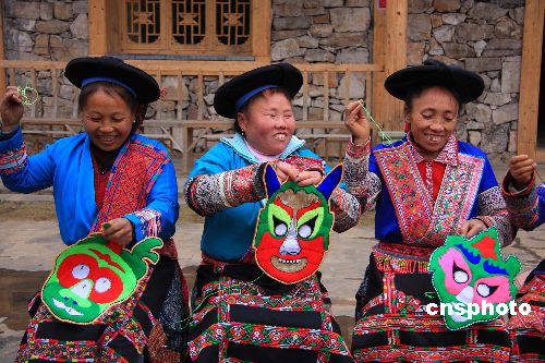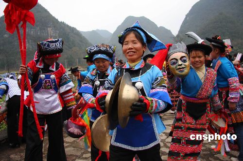 2月8日,大年初二,貴州省興義市間歇泉民族村布依族、苗族風(fēng)情演出隊(duì)在表演自編自導(dǎo)的民族舞蹈。當(dāng)日,貴州省興義市間歇泉民族村村民自發(fā)在村里組織了一臺(tái)自編自導(dǎo)的民族風(fēng)情表演及體育活動(dòng),拉開(kāi)了山寨鬧新春,迎奧運(yùn)的序幕。中新社發(fā) 韋波 攝