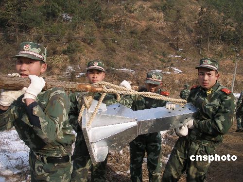 2月8日,湖南省婁底市武警支隊(duì)100多名武警官兵冒著風(fēng)雪和山高路滑,每天將近20噸電力鐵塔的部件分散運(yùn)送到湘鄉(xiāng)市壺天鎮(zhèn)山上進(jìn)行線路搶修。中新社發(fā) 郭國(guó)權(quán) 攝