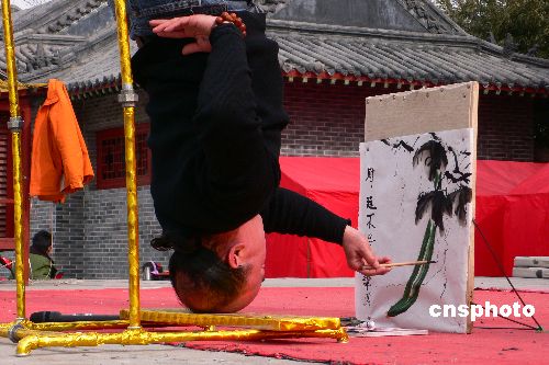 2月9日,在河南省開封市翰園碑林舉辦的第九屆春節(jié)祭祖大廟會上,中華奇人閻玉華人體倒立作畫和人體倒立在鋼錐上書畫絕活、絕技,讓游客大開眼界。中新社發(fā) 凱楓 攝
