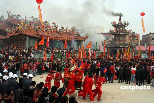 2月10日中午,廈門市同安區(qū)西柯鎮(zhèn)呂厝村四年一次民間民俗盛事--迎“王船”活動吸引了眾多的群眾。當(dāng)?shù)孛癖娦欧畹倪@個王爺叫“代天巡狩”。傳說“代天巡狩”神威顯赫,總能替天行道,愛護(hù)百姓,當(dāng)?shù)孛癖姸己芫囱鏊R蚨,到了新舊王爺?shù)慕唤幽,?dāng)?shù)厝罕姸紩e行“送王”和“迎王”慶典,表達(dá)他們祈平安慶豐收的心情。通常,申子辰年(鼠、龍、猴年)為新舊王爺交接年,交接年間的正月初四為迎接新任王爺?shù)氖,同年的農(nóng)歷十月?lián)袢諝g送原任王爺,形成了四年一任的民間迎送王爺?shù)氖。中新社發(fā) 吉辛 攝