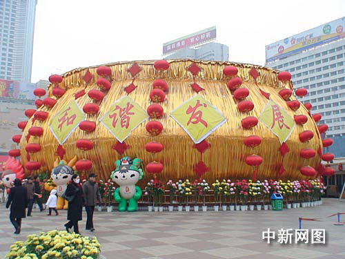 蘭州東方紅廣場(chǎng)巨型燈籠與福娃造型交相輝映
