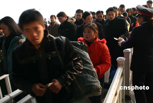 2008年2月11日,春節(jié)長假接近尾聲,人們紛紛踏上返程路,有的回家,有的奔赴工作崗位。南京火車站因此迎來春節(jié)后的客流高峰。中新社發(fā) 阿董 攝