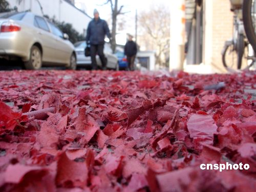 2月13日是正月初七,蘇州許多商家在節(jié)后營(yíng)業(yè)第一天燃放“開(kāi)門(mén)炮”,許多街道上一地紙屑。 中新社發(fā) 王建康 攝