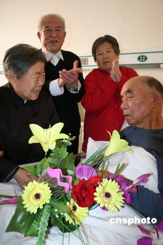 2月13日下午,在山東聊城光明眼科醫(yī)院老年護(hù)理中心,78歲的劉躍明(左一)向丈夫邊松獻(xiàn)上一束玫瑰,來紀(jì)念夫妻53年的風(fēng)雨同舟。據(jù)了解,邊松于2008年1月,因患腦出血造成上指活動障礙。中新社發(fā) 孔政 攝