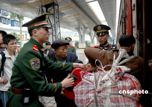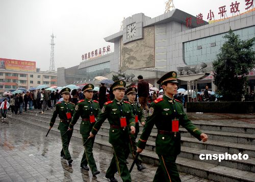 圖:武警在四川廣安火車(chē)站維護(hù)民工回流秩序