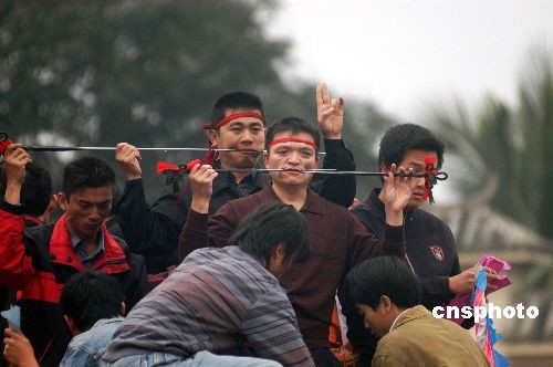 2008年2月16日,瓊海市,祈求五谷豐登,風(fēng)調(diào)雨順。“軍坡”是海南民間的一個(gè)傳統(tǒng)節(jié)日,相傳源于唐代,為紀(jì)念六世紀(jì)我國(guó)嶺南著名俚人首領(lǐng)冼夫人而舉行的祭祀活動(dòng),距今已有1300多年歷史。獨(dú)特的民俗風(fēng)情吸引了大批游客。中新社發(fā) 蒙鐘德 攝