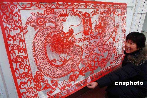 河南周口市剪紙女藝人陳雪英用了一周時(shí)間創(chuàng)作出剪紙作品“龍迎奧運(yùn)”。該幅作品長(zhǎng)2米,寬1米,上刻有雙龍飛騰,奧運(yùn)五環(huán)、福娃踏云、吉祥白鴿及北京2008等圖案和字樣。以中華民族的圖騰龍為主題的迎奧運(yùn)作品充分表達(dá)了作者對(duì)北京奧運(yùn)的期盼和祝福。中新社發(fā) 楊正華 攝