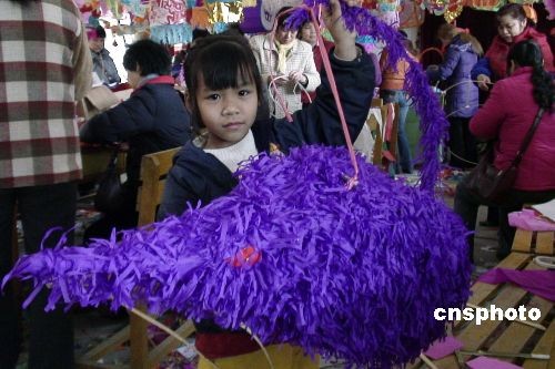 二月二十日,廣西南寧市菠蘿嶺社區(qū)居民忙著扎制花燈,一女孩展示扎制好的鼠形花燈。過元宵賞花燈是當(dāng)?shù)亓?xí)俗。中新社發(fā) 王剛 攝