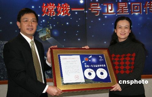 二月二十一日下午,中國國防科學技術工業(yè)委員會月球探測工程中心在北京舉行儀式,將“嫦娥一號”衛(wèi)星自三十八萬公里外太空傳回地球的天籟之音,贈送中央人民廣播電臺、中國國際廣播電臺和中央電視臺,供三家官方廣電媒體隨時選擇向海內(nèi)外播放。圖為月球探測工程中心副主任張榮橋(左)向中央人民廣播電臺贈送刻錄有三十首天籟之音的光盤。中新社發(fā) 孫自法 攝