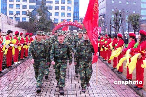 2月25日下午,湖南省郴州市委、市政府、郴州軍分區(qū)舉行盛大儀式,歡送支援郴州抗冰救災(zāi)的部隊(duì)官兵離開郴州,數(shù)萬市民冒著細(xì)雨前往郴州五嶺廣場(chǎng)為子弟兵送行。中新社發(fā) 賀茂峰 攝