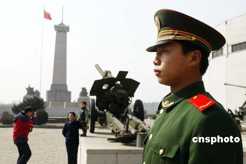 3月1日,丹東邊防檢查站的值勤戰(zhàn)士正在丹東抗美援朝紀(jì)念館執(zhí)行警衛(wèi)任務(wù)。作為遼寧省五家大型博物紀(jì)念館之一的抗美援朝紀(jì)念館當(dāng)天正式向公眾永久免費(fèi)開放,有1000多名國(guó)內(nèi)外游客和市民進(jìn)入紀(jì)念館參觀。為紀(jì)念抗美援朝戰(zhàn)爭(zhēng)勝利55周年,紀(jì)念館建館50周年,展館新增設(shè)的專題展覽成為當(dāng)天開放接待參觀的亮點(diǎn)。中新社發(fā) 陳浩浩 攝