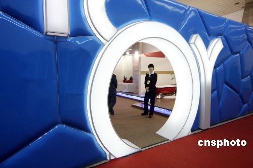 3月2日,2008中國(guó)國(guó)際建筑裝飾及材料博覽會(huì)在北京中國(guó)國(guó)際展覽中心舉行。一家衛(wèi)浴參展商為了吸引客商和觀眾,仿造國(guó)家游泳中心“水立方”造型布置展位。中新社發(fā) 吳芒子 攝