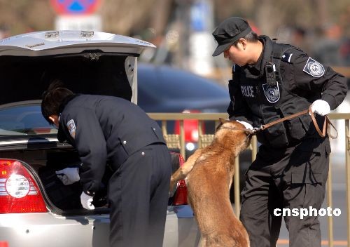 三月三日,安檢人員牽著警犬對所有進(jìn)入天安門廣場的車輛進(jìn)行安全檢查。當(dāng)日下午,全國政協(xié)十一屆一次會議在北京人民大會堂隆重開幕。中新社發(fā) 王東明 攝