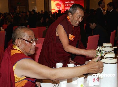 三月三日下午,全國(guó)政協(xié)十一屆一次會(huì)議在北京人民大會(huì)堂隆重開幕,來(lái)自西藏的全國(guó)政協(xié)委員在會(huì)場(chǎng)喝到可口的茶水,深感“賓至如歸”。中新社發(fā) 潘索菲 攝