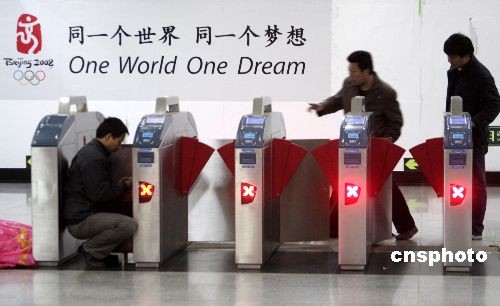 3月3日,工作人員在調(diào)試北京地鐵1號線天安門東站的自動檢售票系統(tǒng)。隨著奧運會臨近,北京地鐵1、2號線的新設(shè)備配套系統(tǒng)正在加緊調(diào)試,以便服務(wù)奧運會的正常使用。據(jù)工作人員介紹,地鐵車站安裝的新設(shè)備是自動檢售票系統(tǒng),出入口處的是閘機(jī),其相應(yīng)的配套設(shè)備還有自動售票和充值機(jī)。目前5號線已全線調(diào)試完畢,但還需時間對地鐵1、2、13號線進(jìn)行調(diào)試,預(yù)計6月后,北京地鐵線路都要開通和使用自動檢售票系統(tǒng)。中新社發(fā) 吳芒子 攝