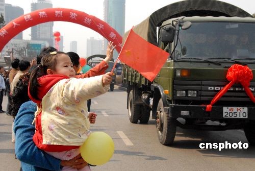 2008年3月5日,貴陽市人民廣場,援黔抗凝凍部隊(duì)返程受到社會各界人民群眾夾道歡送。據(jù)悉,貴州省在受凝凍災(zāi)害期間,得到中國人民解放軍及社會各界的援助,電力搶修按預(yù)期提前190余天完成,目前貴州送往省外的電路全部投入送電。中新社發(fā) 張?zhí)炝?攝