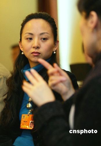 3月5日,全國(guó)政協(xié)十一屆一次會(huì)議進(jìn)行政府工作報(bào)告小組討論。以“千手觀音”舞蹈揚(yáng)名天下的邰麗華委員在文藝界小組討論中,通過手語翻譯與其他委員交流。邰麗華是中國(guó)殘疾人藝術(shù)團(tuán)藝術(shù)總監(jiān)。中新社發(fā) 盛佳鵬 攝