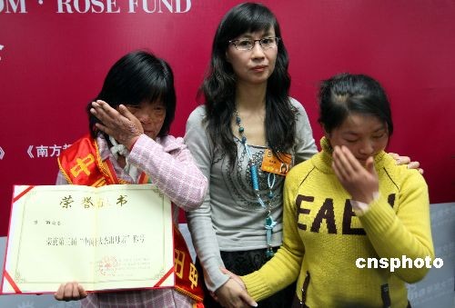 2008中國(guó)十大杰出母親熊麗(左)、被硫酸毀容的受助患者韓鳳宇成為第一批受助者。圖中為全國(guó)政協(xié)委員張曉梅。