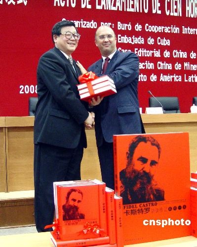 三月七日,古巴領(lǐng)袖菲德爾·卡斯特羅中文版自傳《卡斯特羅訪談傳記:我的一生》首發(fā)式在北京中國社科院舉行,他親自為該書撰寫了序言《致中國人民》,并在其中表示“在二十一世紀(jì)的世界形勢下,應(yīng)該依靠中國”。圖為中國社科院副院長王偉光向古巴駐華大使卡洛斯·米格爾·佩雷拉贈送中文版自傳。中新社發(fā) 應(yīng)妮 攝