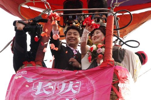 3月8日,鄭州一對情侶乘坐熱氣球升空舉辦空中婚禮,隨著熱氣球的徐徐上升,空中的新娘手提花籃向下拋灑玫瑰花,新郎頻頻的向地上的親朋好友揮手致意,在熱氣球上,他們異口同聲的大聲呼喚:“祝天下的女士婦女節(jié)快樂”。中新社發(fā) 王中舉 攝