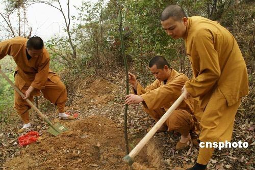 3月12日中國植樹節(jié),廣東南海西樵山寶峰寺的僧侶在西樵山國家森林公園參加植樹造林。有珠江西岸文明燈塔之稱的廣東南海西樵山國家森林公園,經(jīng)過多年植樹造林,森林覆蓋率已達(dá)到90%以上。中新社發(fā) 孫建駒 攝