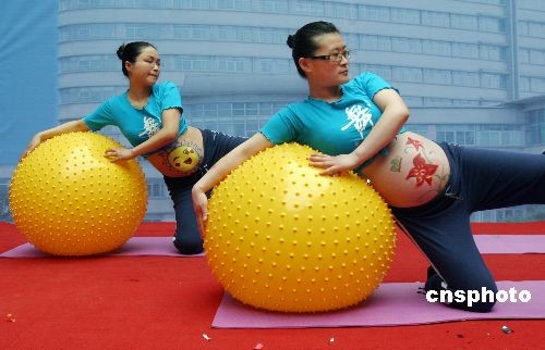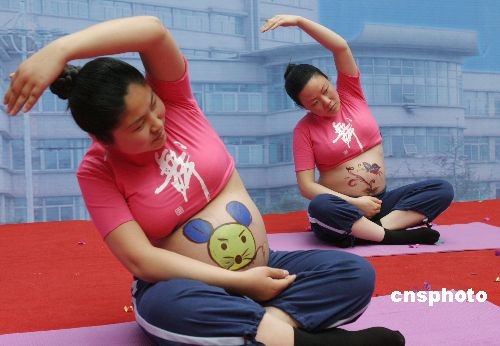 3月15日,眾多準媽媽和在江蘇連云港市第一人民醫(yī)院展示母子康樂保健帶來的樂趣。經(jīng)過孕婦學(xué)校、孕媽咪沙龍、體功訓(xùn)練等孕前培訓(xùn)的準媽媽大膽地在舞臺上舞動身姿表演孕前保健操。中新社發(fā) 王健民 攝