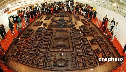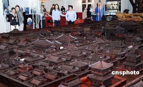 3月20日,為期5天的“第六屆全國(guó)工藝品、旅游品、禮品博覽會(huì)暨第十一屆春季(大連)中國(guó)古玩藝術(shù)品博覽會(huì)”在大連星海會(huì)展中心舉行。在展會(huì)西廳區(qū),一個(gè)一展現(xiàn)古都風(fēng)貌喜迎2008年奧運(yùn)會(huì)為創(chuàng)作宗旨的按正式比例縮小120倍的紫檀巨雕故宮全景,吸引了眾多市民的眼球。這個(gè)作品9米長(zhǎng),寬7米,總面積60余平方米,由50余位高級(jí)技師歷時(shí)6年精心雕制而成。該作品無論從用料、耗時(shí)都令人稱絕。如此大型紫檀木雕藝術(shù)作品也實(shí)屬罕見。中新社發(fā) 劉德斌 攝