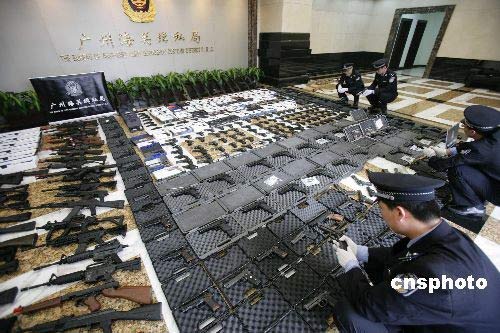 3月21日消息,廣州海關(guān)緝私局宣布,兩年前經(jīng)過艱苦偵查,成功破獲了一個(gè)專門從事走私仿真槍的犯罪團(tuán)伙,該起案件案值逾五百萬元人民幣,走私進(jìn)口數(shù)量逾三千支。近日,廣州市中級(jí)人民法院對(duì)該案作出一審判決:以走私普通貨物罪分別判處譚某等十名被告有期徒刑六年到二年不等。圖為2006年破案后,海關(guān)關(guān)員清點(diǎn)走私仿真槍支。中新社發(fā) 陳國(guó)華 攝