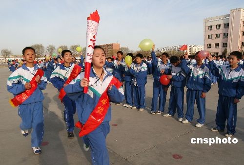 3月24日,為慶祝北京奧運(yùn)圣火在希臘采集,新疆哈密市六中舉辦了“傳遞火炬 點(diǎn)燃激情”為主題的體驗(yàn)奧運(yùn)火炬?zhèn)鬟f活動,千余名學(xué)生參加了體驗(yàn)傳遞奧運(yùn)火炬活動。中新社發(fā) 普拉提 攝