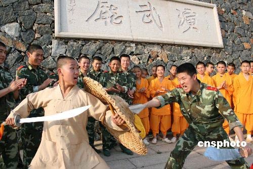 4月6日,武警福建泉州支隊(duì)四中隊(duì)官兵們與駐地南少林武僧進(jìn)行了一場“武林爭霸”賽活動。通過活動,官兵們既增加了對中國傳統(tǒng)少林文化的認(rèn)識了解,也激發(fā)了愛警習(xí)武、苦練軍事技能本領(lǐng)的決心。圖為武警戰(zhàn)士與少林武僧“切磋”功夫的情景。中新社發(fā) 張九強(qiáng) 攝