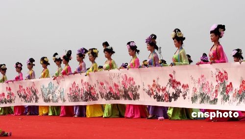 四月十日上午,河南省第二十六屆洛陽牡丹花會(huì)開幕慶典在該市新區(qū)體育中心廣場(chǎng)舉行。開幕式上,一百五十米長(zhǎng)填色牡丹畫被英國吉尼斯總部和中國地區(qū)認(rèn)證官員,當(dāng)場(chǎng)認(rèn)證為世界最長(zhǎng)的填色牡丹畫。中新社發(fā) 王中舉 攝