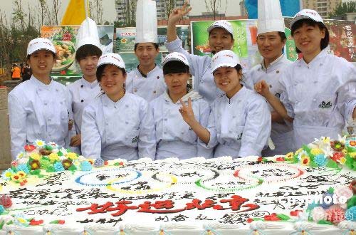 2000年4月24日,北京中央電視塔廣場,第六屆中關村國際美食節(jié)開幕式在此隆重開幕。飲食企業(yè)和社團分別在“綠色餐飲.奧運美食”流行經(jīng)典菜式的展示活動中展示自家拿手的菜肴。圖為北京唐人美食之夜技能培訓學校學生們,展示自己做的“好運北京”五環(huán)旗巨型蛋糕。當日下午,這枚略小于乒乓球桌的蛋糕,將要被切開,學生將于與觀眾們共同分享。