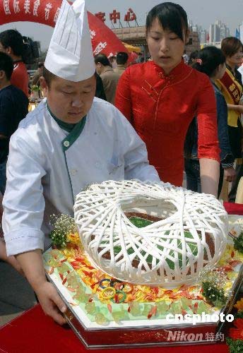 2000年4月24日,北京中央電視塔廣場,第六屆中關(guān)村國際美食節(jié)開幕式在此隆重開幕。飲食企業(yè)和社團(tuán)派出精兵強(qiáng)將,在“綠色餐飲.奧運(yùn)美食”流行經(jīng)典菜式的展示活動中展示自家拿手的菜肴。圖為一家餐廳展示制作精良的美食制品《鳥巢》。中新社發(fā) 鄒憲 攝