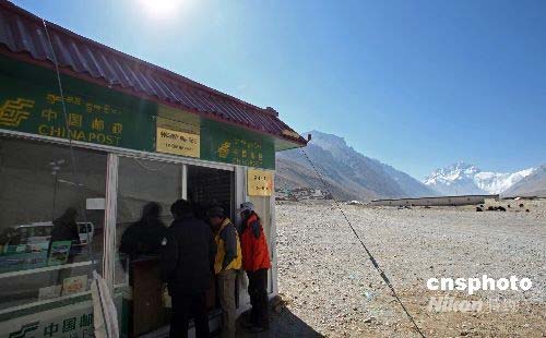 4月29日,位于西藏珠峰大本營(yíng)絨布新聞中心的中國(guó)珠穆朗瑪峰臨時(shí)郵政局,不少采訪北京奧運(yùn)會(huì)火炬接力珠峰展示活動(dòng)的中外記者前來(lái)購(gòu)買具有珠峰特色的北京奧運(yùn)會(huì)紀(jì)念品。中新社發(fā) 盛佳鵬 攝