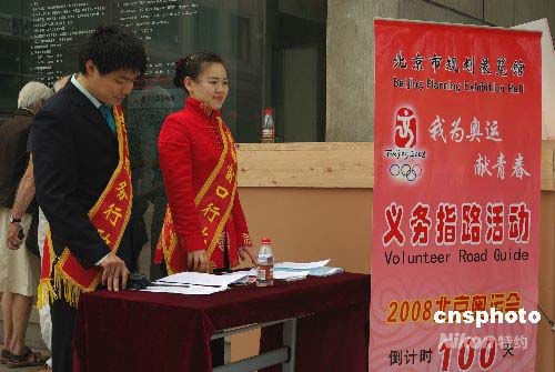 4月29日,在北京奧運(yùn)會倒計時100天即將到來之際,北京市規(guī)劃展覽館在前門東大街開展“我為奧運(yùn)獻(xiàn)青春 義務(wù)指路活動”,為國內(nèi)外游客提供義務(wù)指路服務(wù)。中新社發(fā) 九州 攝