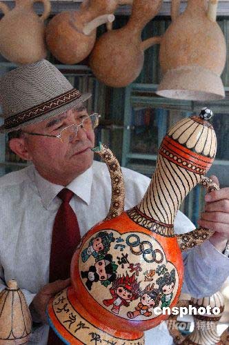 4月29日上午,克里木·吾普爾在看“迎奧運”葫蘆雕刻品。當天,新疆巴州坦順路橋公司退休干部克里木·吾普爾完成了他的“迎奧運”葫蘆雕刻工藝品的最后工序。他說:為表達喜迎北京奧運之情,歷時45天制作出一套刻有“奧運福娃”、“中國印”等內(nèi)容的葫蘆雕刻工藝品。中新社發(fā) 確·胡熱 攝