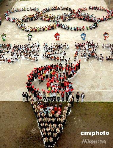 4月28日下午,四川省華鎣市古橋初中、華鎣市職業(yè)中學(xué)、華鎣市國家稅務(wù)局等部門的1500多名學(xué)生、教職員工,一起組成“祝奧運成功”五個大字及火炬、五環(huán)、福娃等奧運圖案,迎接北京奧運會倒計時100天的到來。 中新社發(fā) 邱海鷹 攝