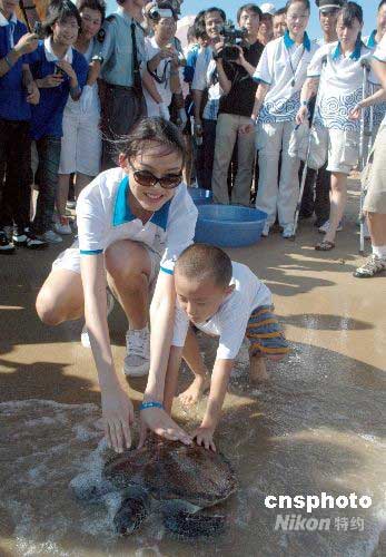 北京奧運(yùn)會(huì)火炬接力海南省傳遞五月四日傳遞將在三亞首發(fā)。三日,聯(lián)想和"藍(lán)絲帶"在三亞組織保護(hù)海洋活動(dòng),倡導(dǎo)綠色奧運(yùn)。圖為世界小姐張梓琳和孩童在三亞灣海邊放歸大海龜。中新社發(fā) 王辛莉 攝