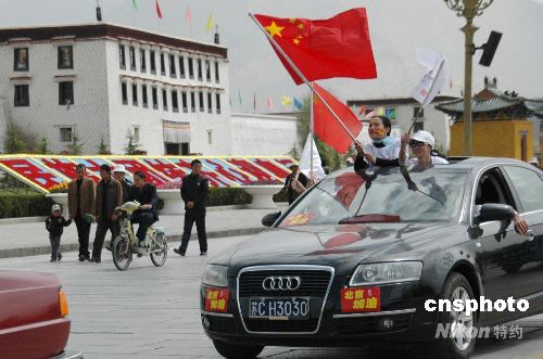 5月4日,自發(fā)來自四川、青海、云南等地,為北京奧運(yùn)會助威加油的車隊從拉薩的布達(dá)拉宮前駛過。這群來自中國各地的青年,是通過網(wǎng)絡(luò)聯(lián)系認(rèn)識的,自發(fā)相約自駕車到拉薩開展“奧運(yùn)情中國心”活動,為北京奧運(yùn)會助威加油。 中新社發(fā) 周波 攝
