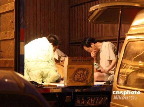 5月12日晚,成都的眾多市民均聚集在空曠地區(qū)或廣場過夜。據悉,截至13日零點,四川災區(qū)死亡人數已達近萬人。圖為兩名當地市民在停在廣場邊的貨車箱內過夜。中新社發(fā) 郭晉嘉 攝